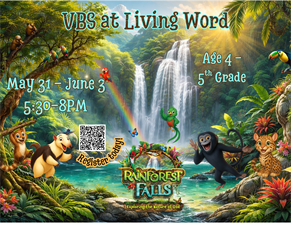 This year's theme is Rainforest Falls: Exploring the Nature of God. Step through the mist into Rainforest Falls, overflowing with wild waterfalls, towering trees, and colorful creatures. Beneath a canopy of chattering birds and howling monkeys, kids plunge into a lifelong adventure of discovering the nature of God. They’ll explore what it means to be rooted in relationship with God, their creator, a safe place in life’s storms.