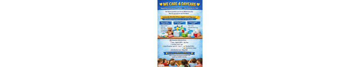 We Care 4 Daycare will have a donation collection event on Saturday April 25th, 2026 from 10am-2pm. We will be accepting Daycare related needs such as; diapers, wipes, rash ointment, paper towels, disinfectant spay/towels, and disposable plates & cups.